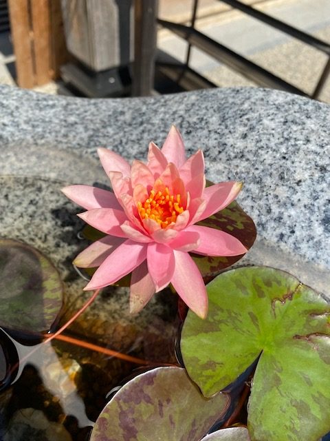 本堂前に設置されている天水鉢に睡蓮が植えてあります。