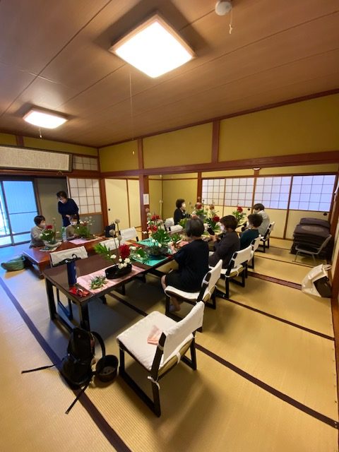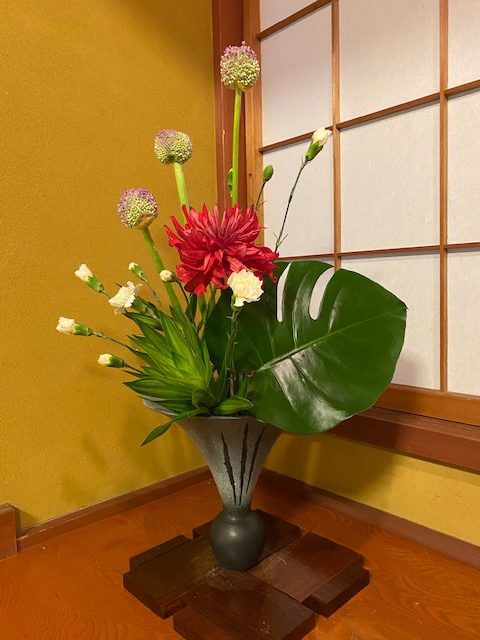 5月のメイン華材は真っ赤なダリア。たった一本でも存在感がハンパなかったです!今回も皆さん、ステキに生けていました☆