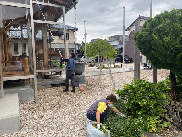 夏は境内地と墓地の草むしり・本堂階段や縁側を護る暴風ガラスの洗浄・本堂内の三具足のお磨きをします。