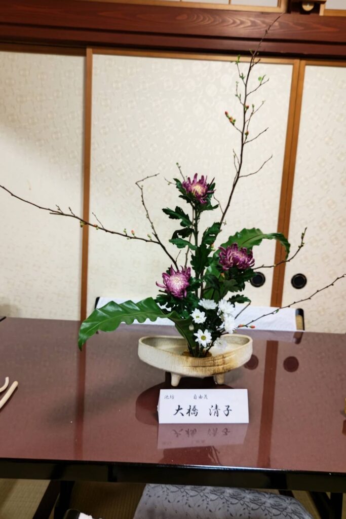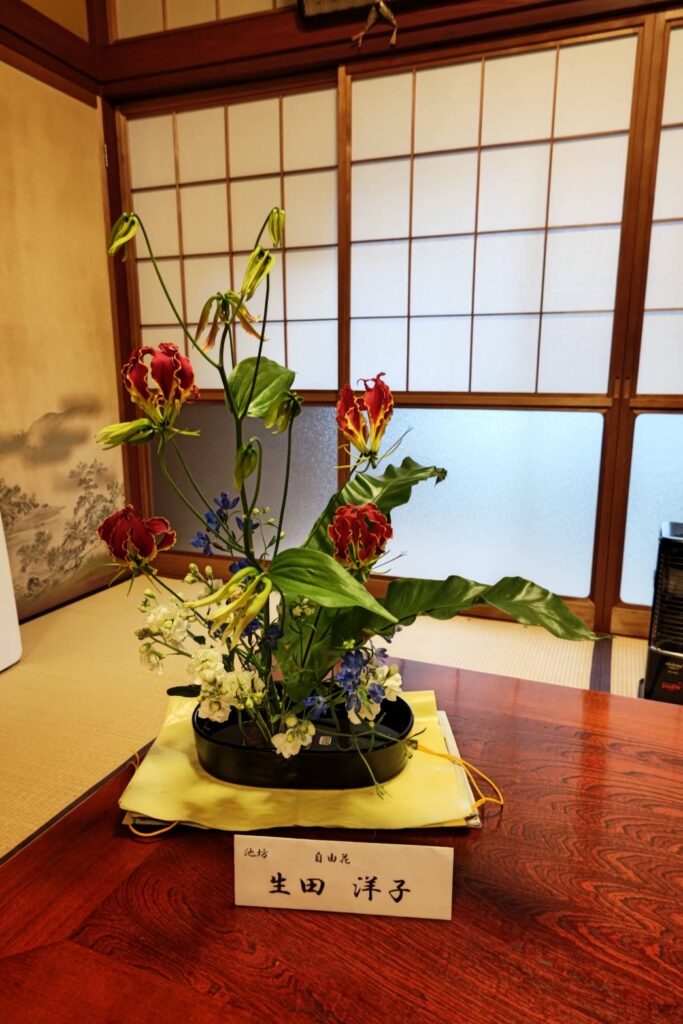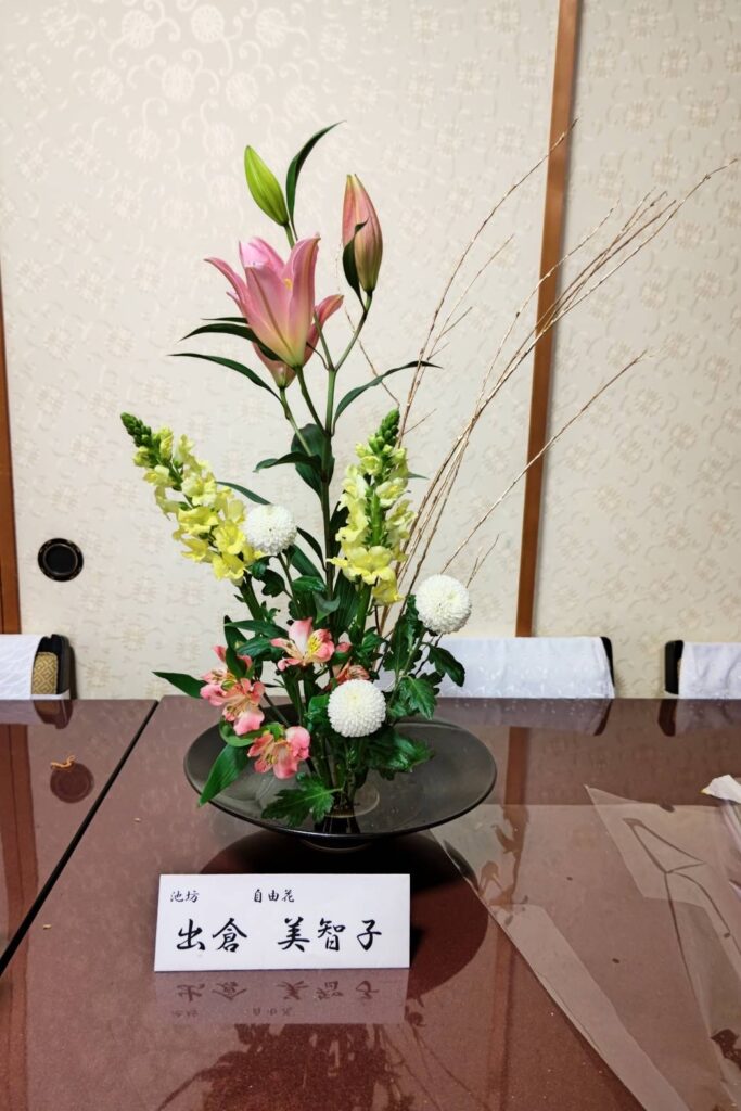 1月8日新春初祈祷会で、ご法前に五名の方が生け花を展示しました。