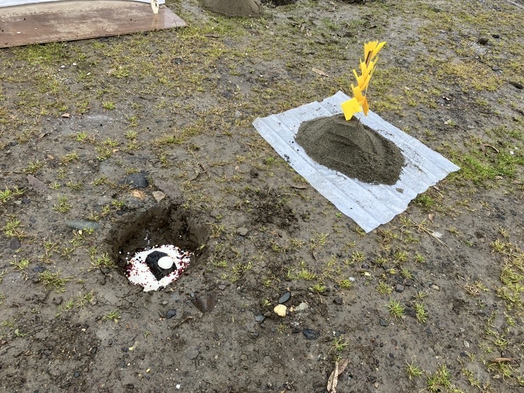午前9時から請負業者3名と、竹を立て縄を張り、幣束を吊ったり穴を掘ったりと、丁寧かつ迅速なる設営。