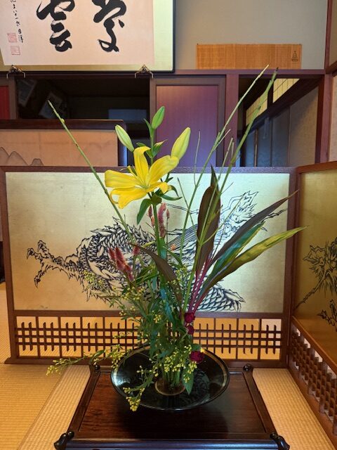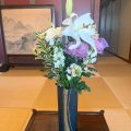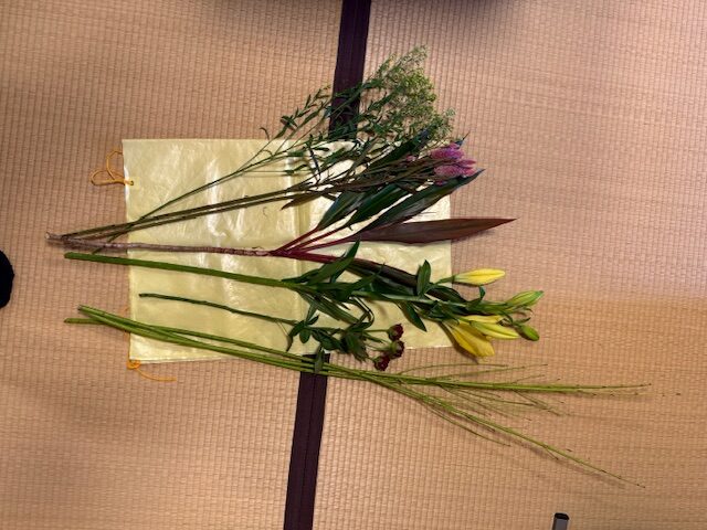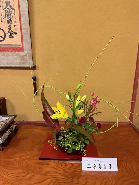 そのまま立てて使ってもよし、曲げて使ってもよし、丸めて使った作品もありました。バラやユリも入って秋らしい作品が完成しました。
