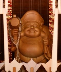 商売繁盛や家門繁栄のみならず、五穀豊穣・出世開運・延命長寿の神として信仰されてきた。そのお姿は、福徳円満の体と笑を浮かべ、左手には袋・右手には小槌を持ち、米俵の上に立つ。